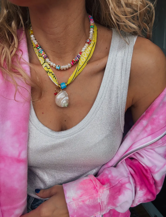 Neon Bandana Scarf Necklace with Nautilus Shell