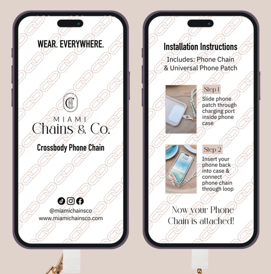 - Each Chain comes with an ultra-thin phone patch that comfortably fits between any phone and its case, enabling you to connect the chain to the patch through the charging port.