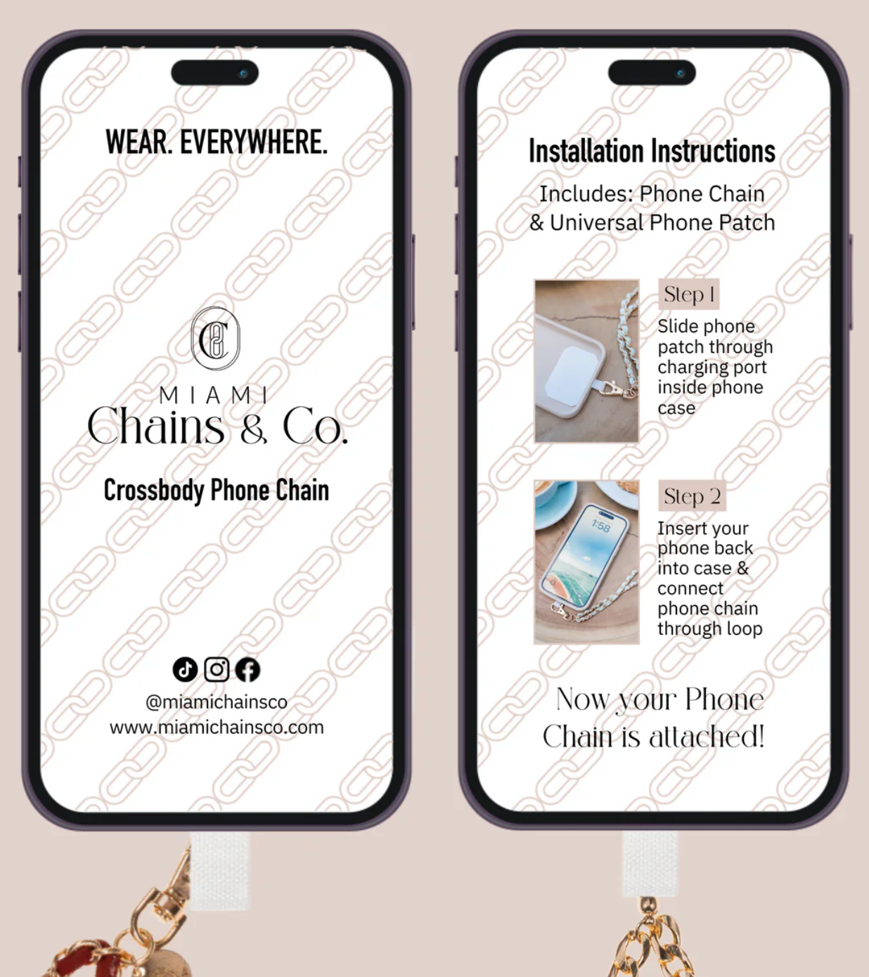 - Each Chain comes with an ultra-thin phone patch that comfortably fits between any phone and its case, enabling you to connect the chain to the patch through the charging port.