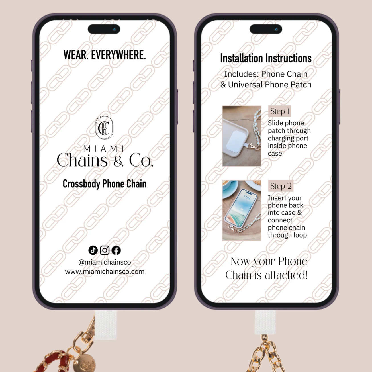 - Each Chain comes with an ultra-thin phone patch that comfortably fits between any phone and its case, enabling you to connect the chain to the patch through the charging port.