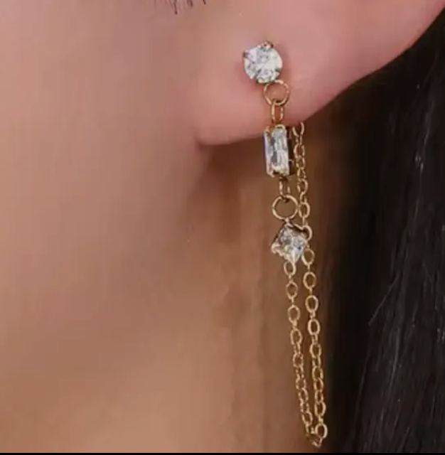 Chain Earring- 3 CZ station Chain Stainless Steel 14K Gold