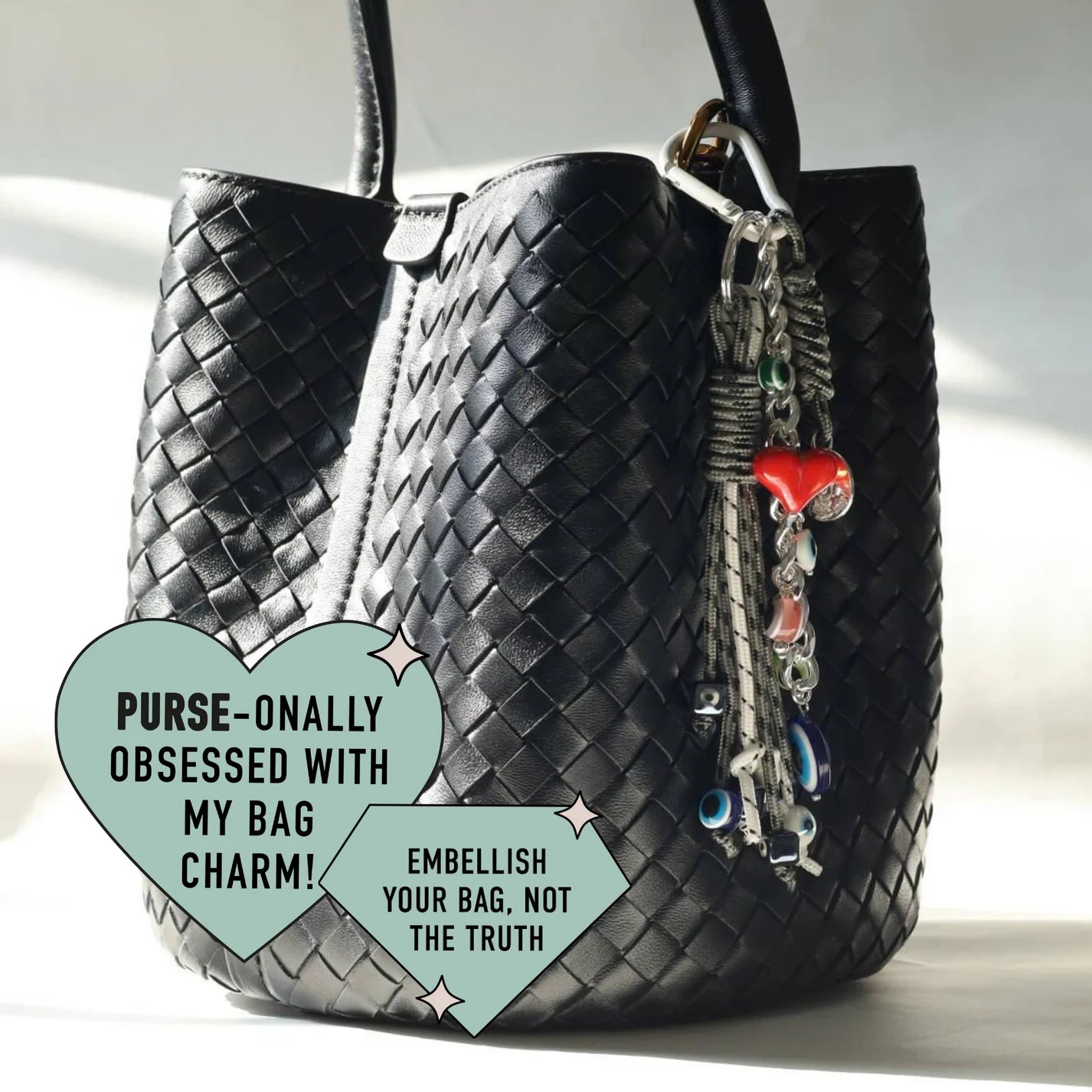 Bag Charm featuring Silver Plated Cuban Link Chain adorned with Evil Eye Glass beads and Jumbo Red Heart Pendant, Grey/Charcoal Nylon Cords.