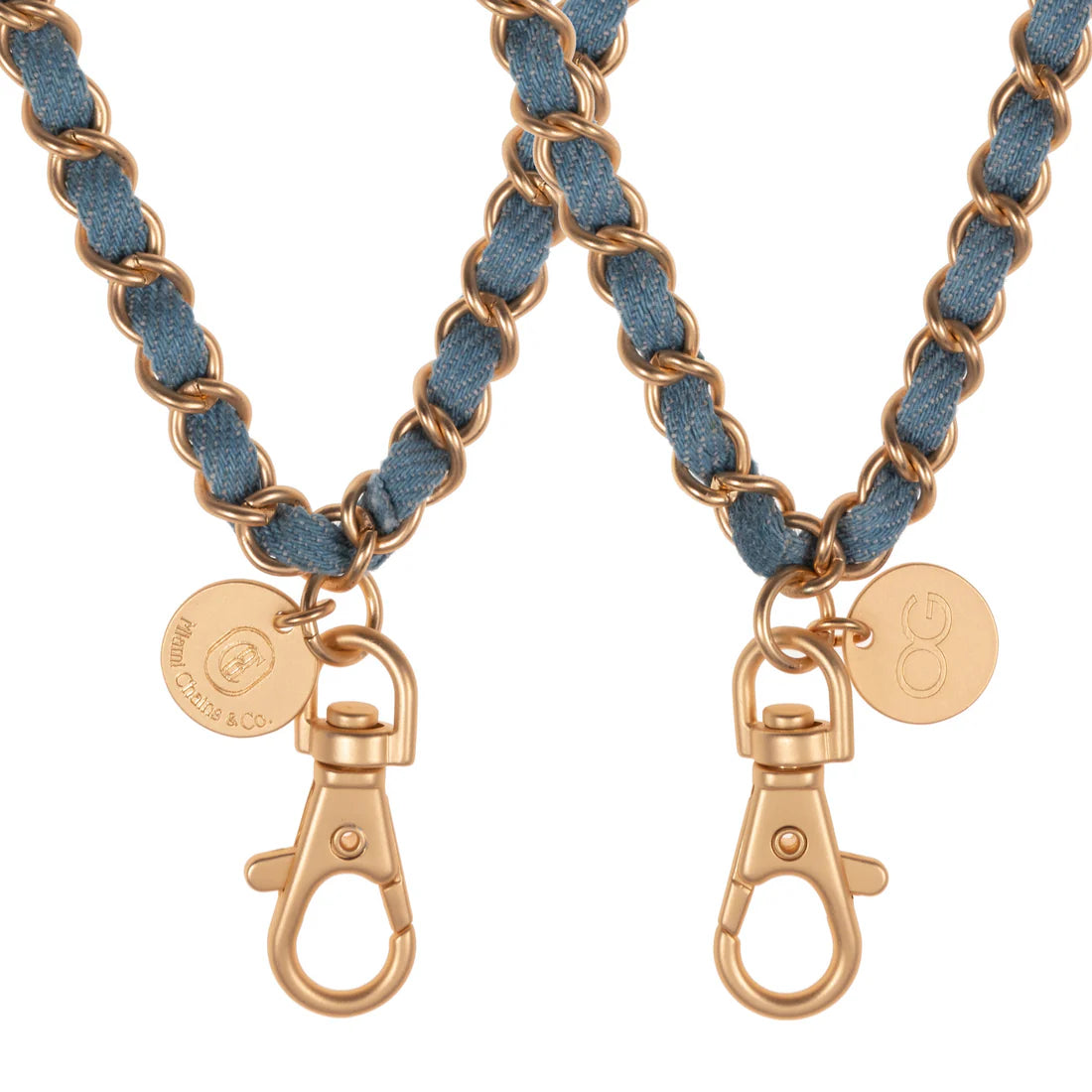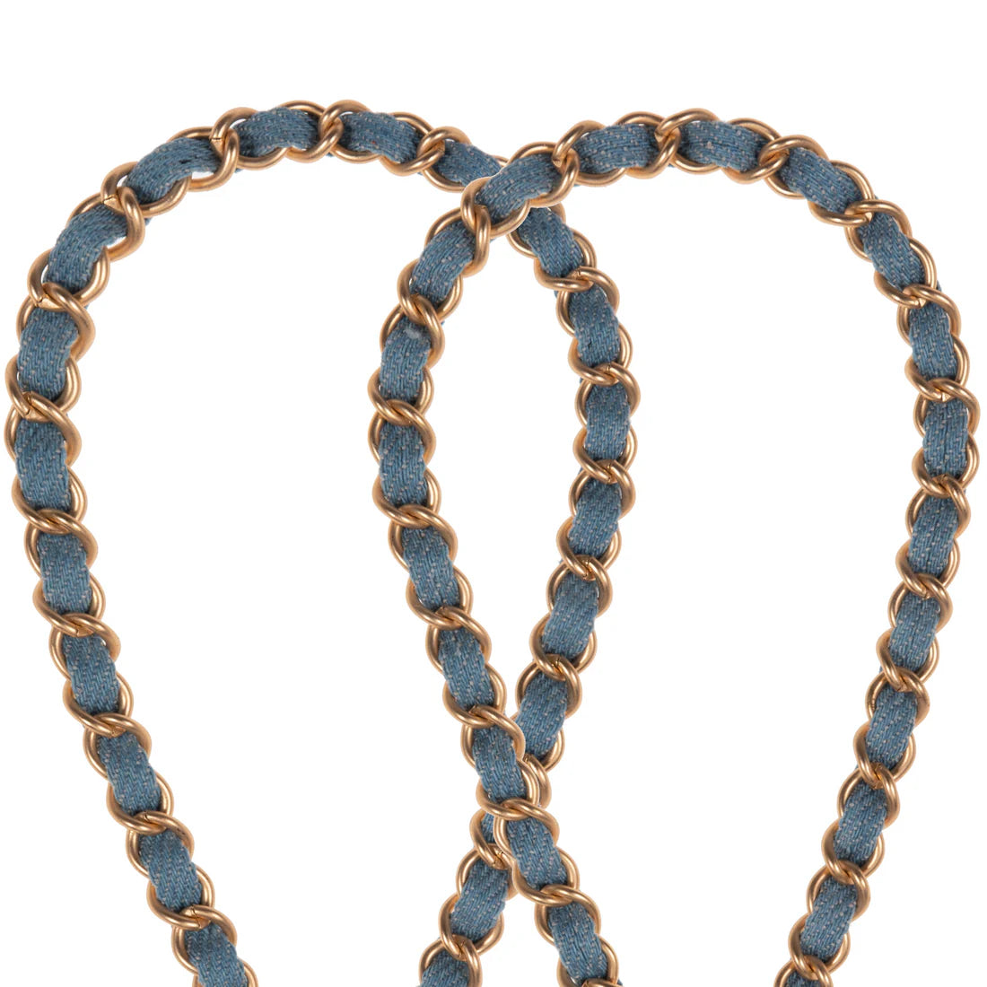 Phone Wristlet featuring Matte Gold Plated Chain w/ 100% Denim Woven Throughout. Turn your phone into a wearable accessory that keeps you hands-free... think of it as a bracelet for your cell phone!