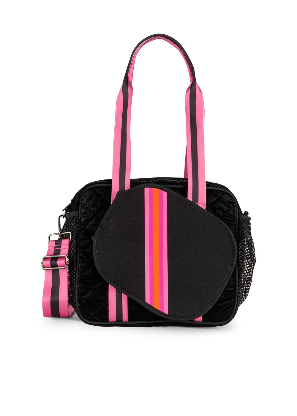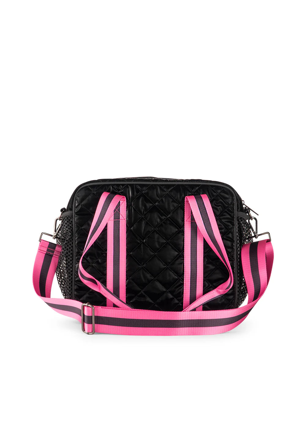 - Black shiny quilted puffer with black neoprene/ pink & orange striped head.