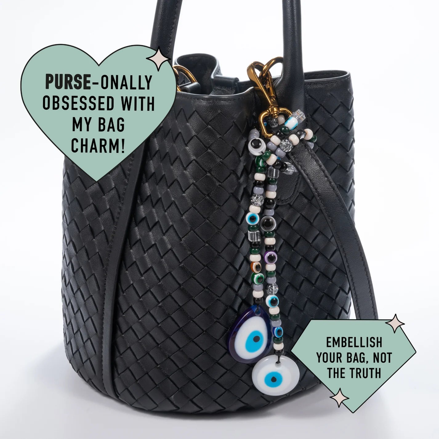 Elevated Bag Charm featuring assorted black + white / evil eye beads with jumbo Evil Eye pendants on both ends . Wrap in a loop around the handle of any handbag.
