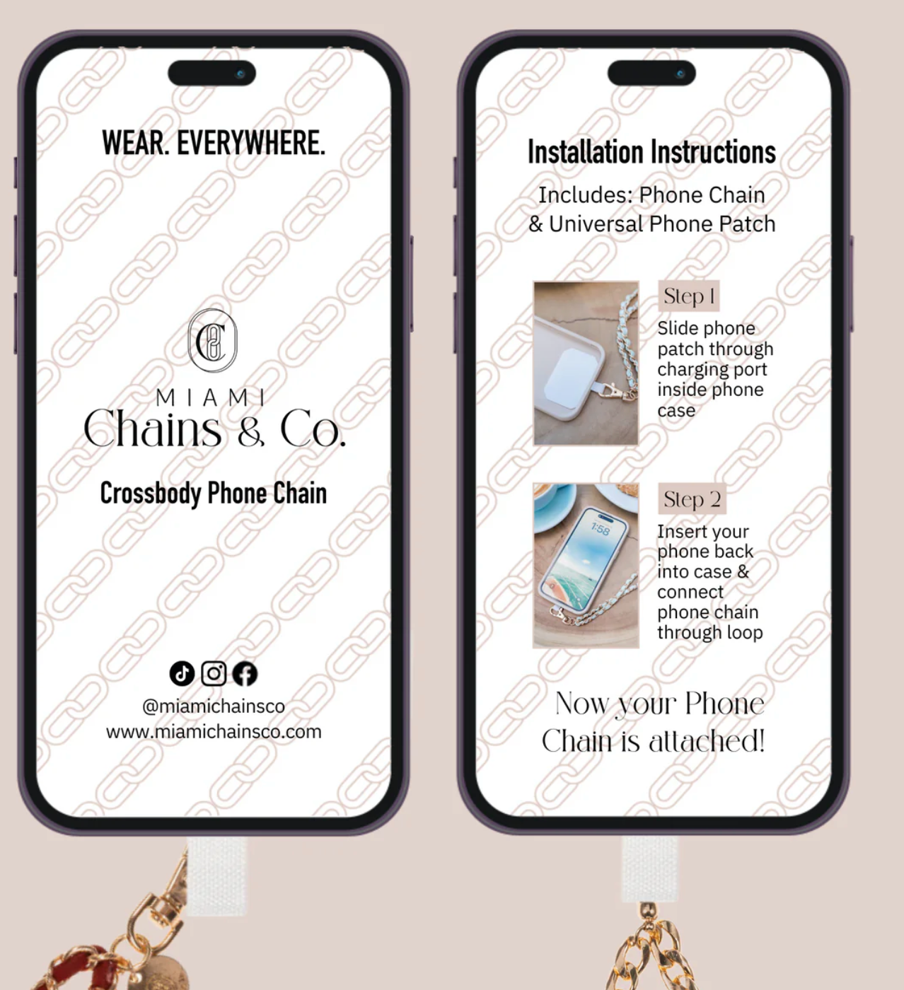 - Each Chain comes with an ultra-thin phone patch that comfortably fits between any phone and its case, enabling you to connect the chain to the patch through the charging port.