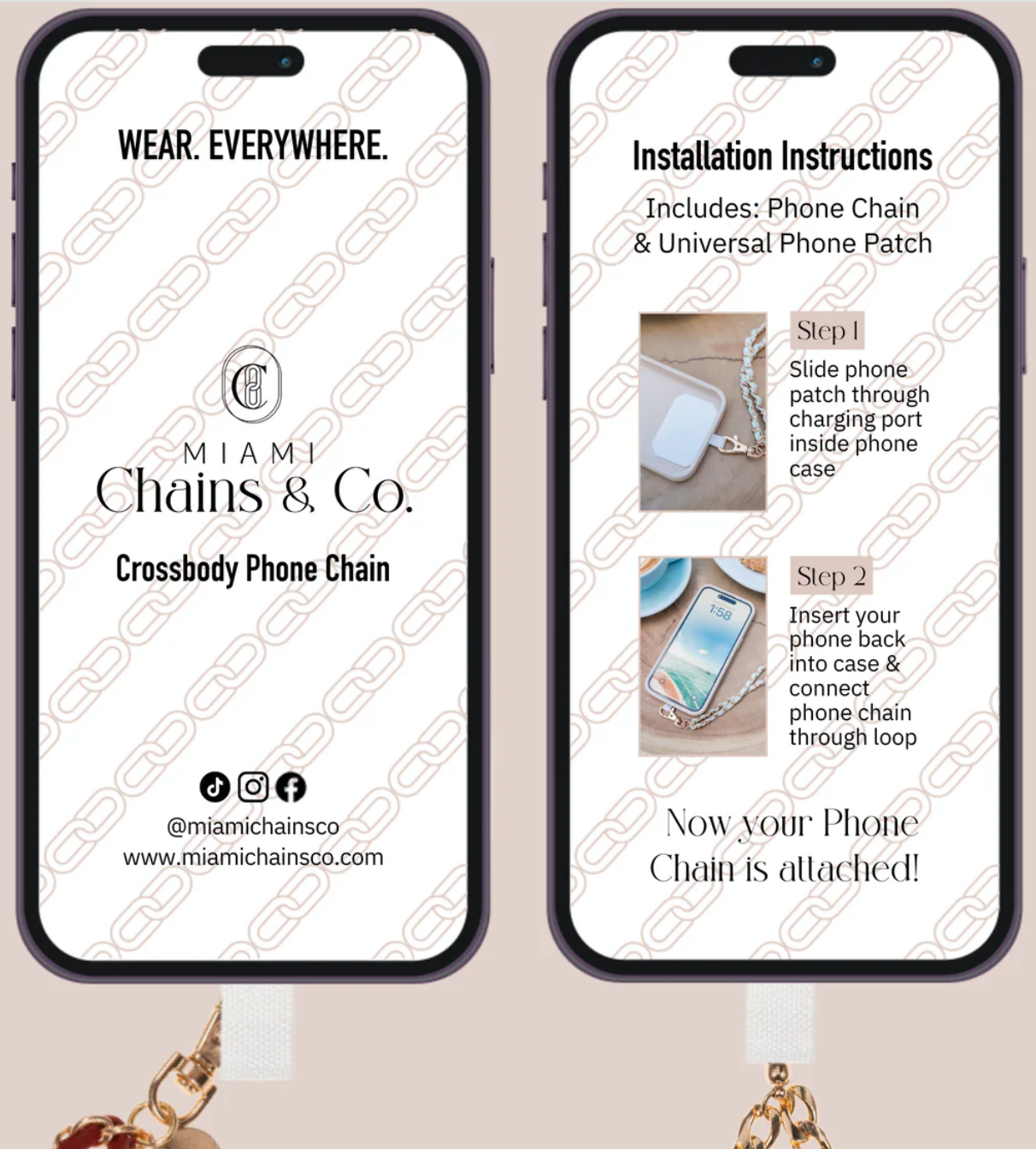 - One chain fits all phones: with your existing phone case!