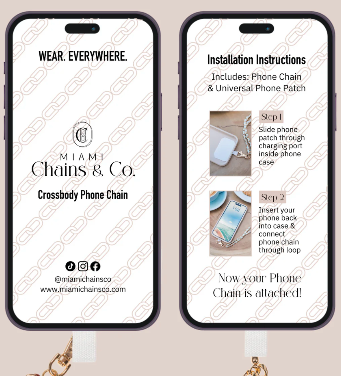 - Each Chain comes with an ultra-thin phone patch that comfortably fits between any phone and its case, enabling you to connect the chain to the patch through the charging port.