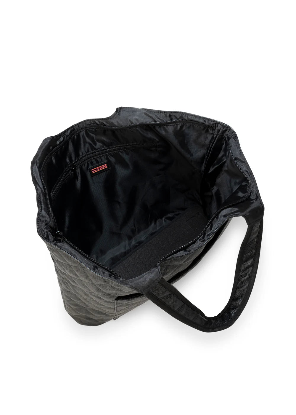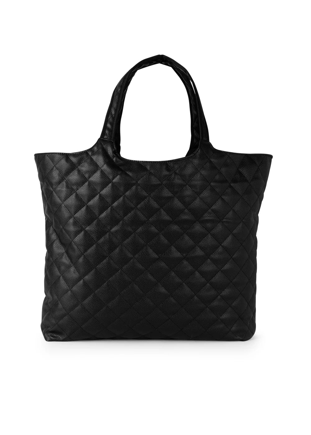- Quilted tote with large exterior slip pocket and interior zip and slip pockets.