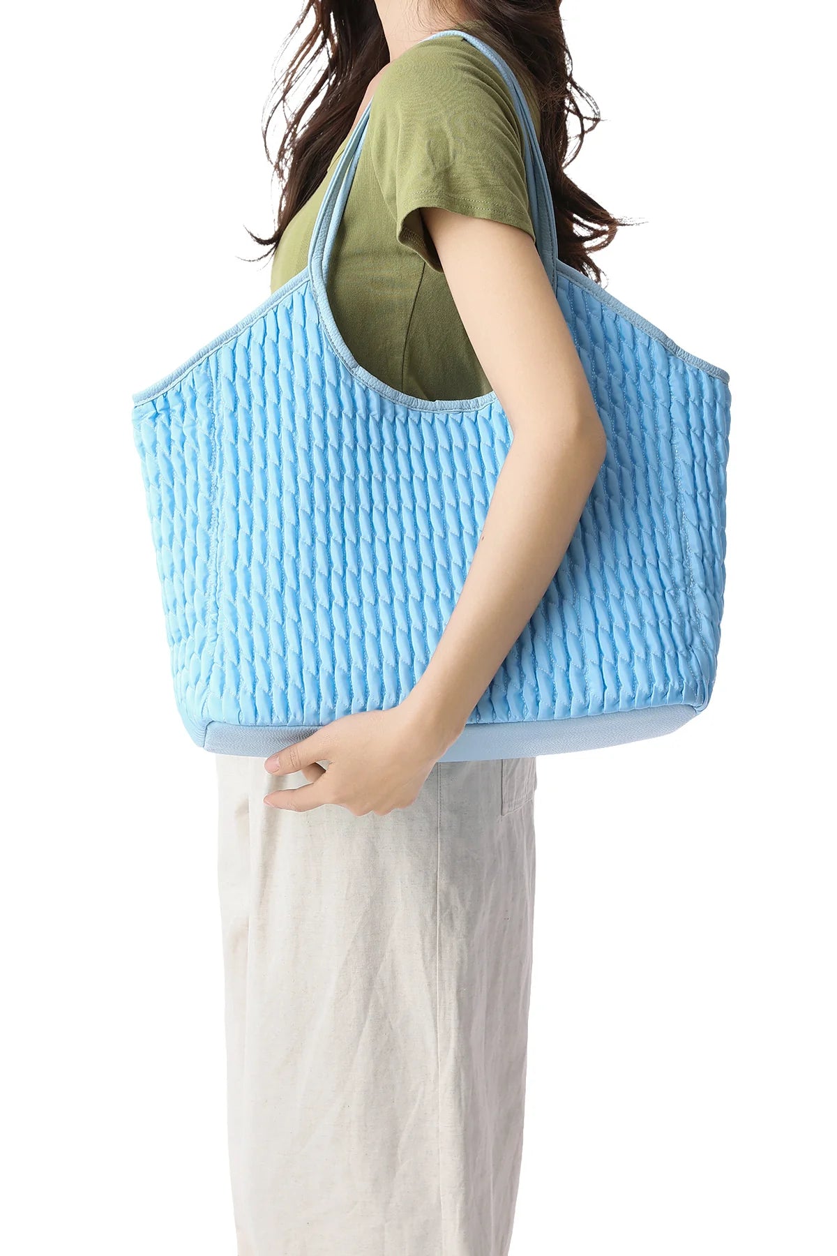 - Nylon Puckered Puffer Tote with magnetic closure and removable wristlet pouch.