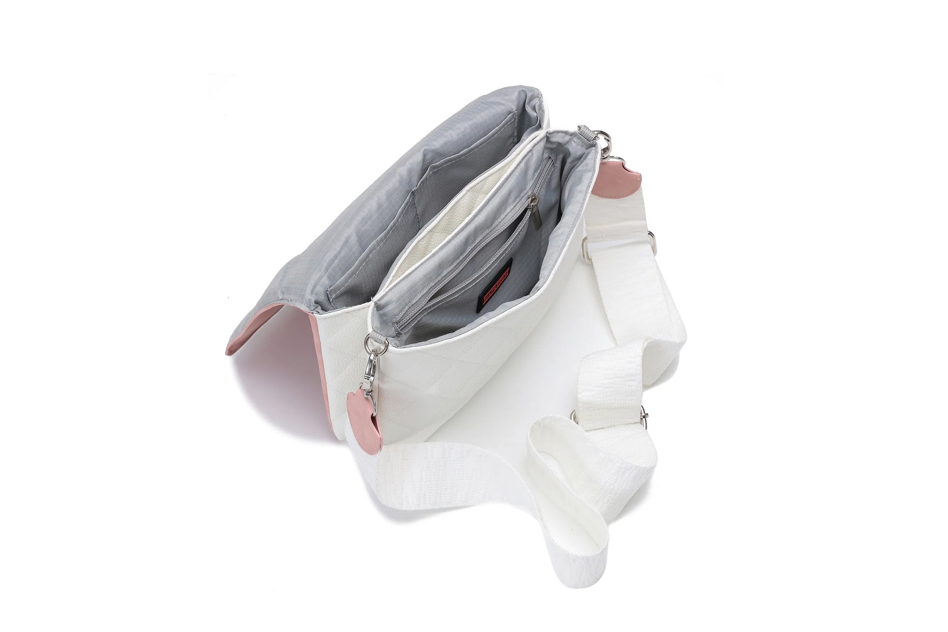 - Flap crossbody with 2 accordion segments. Exterior back slip pocket. Interior slip and zip pockets.