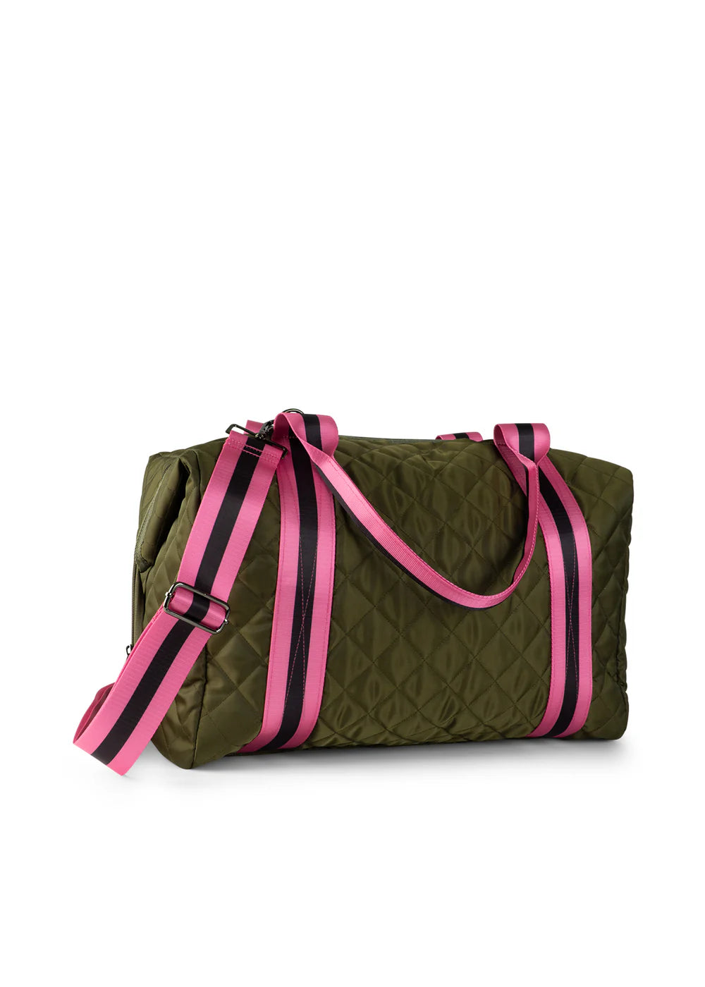 - Olive quilted nylon with pink and black straps.