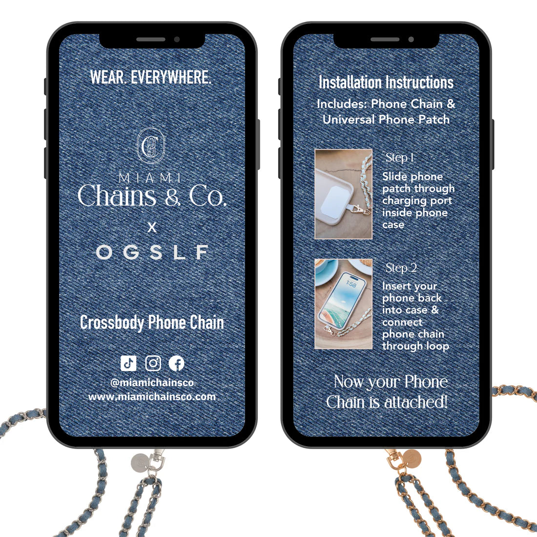 - Each Chain comes with an ultra-thin phone patch that comfortably fits between any phone and its case, enabling you to connect the chain to the patch through the charging port.
