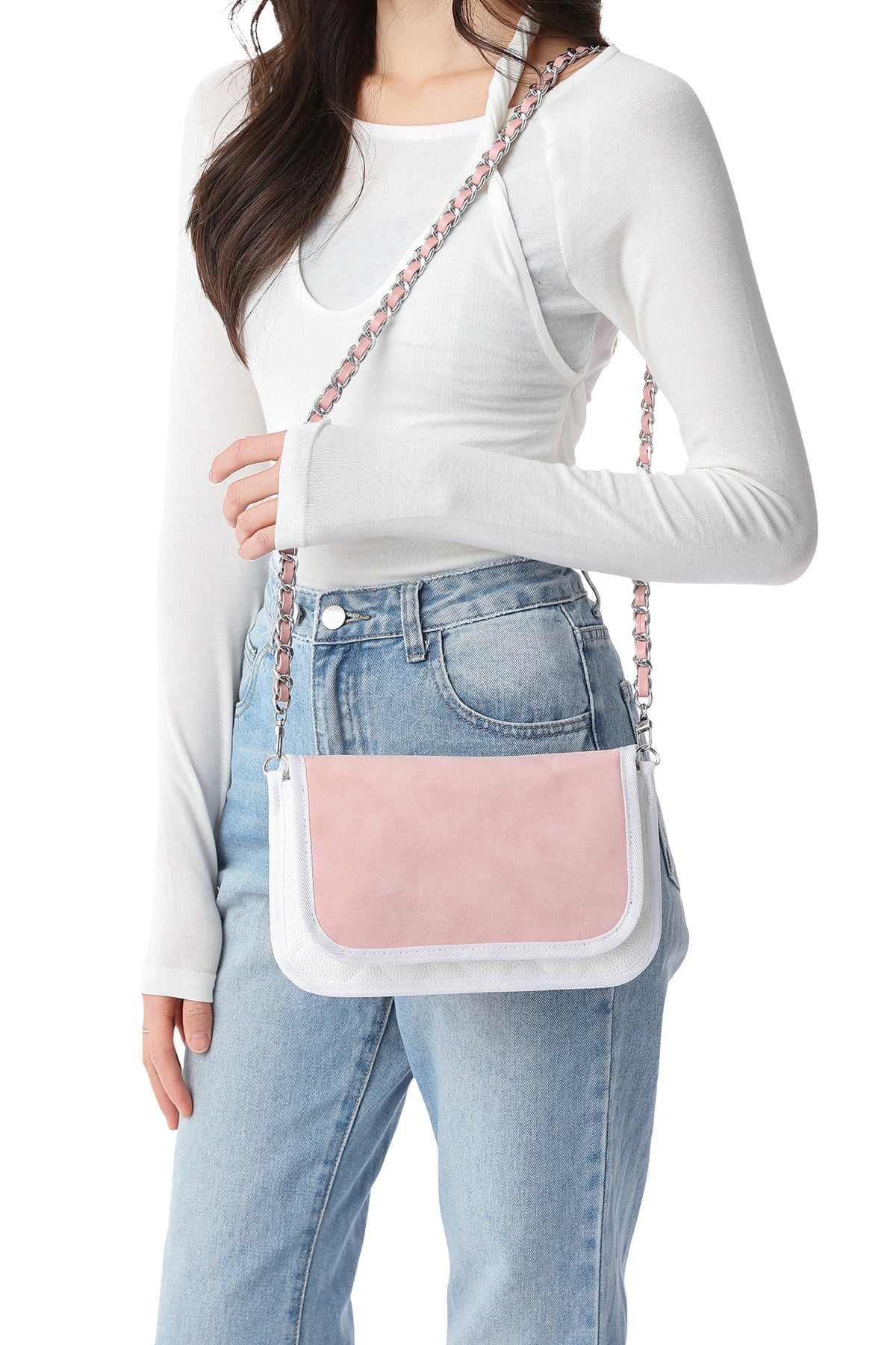 - Blush vegan suede/white quilted vegan pebbled leather