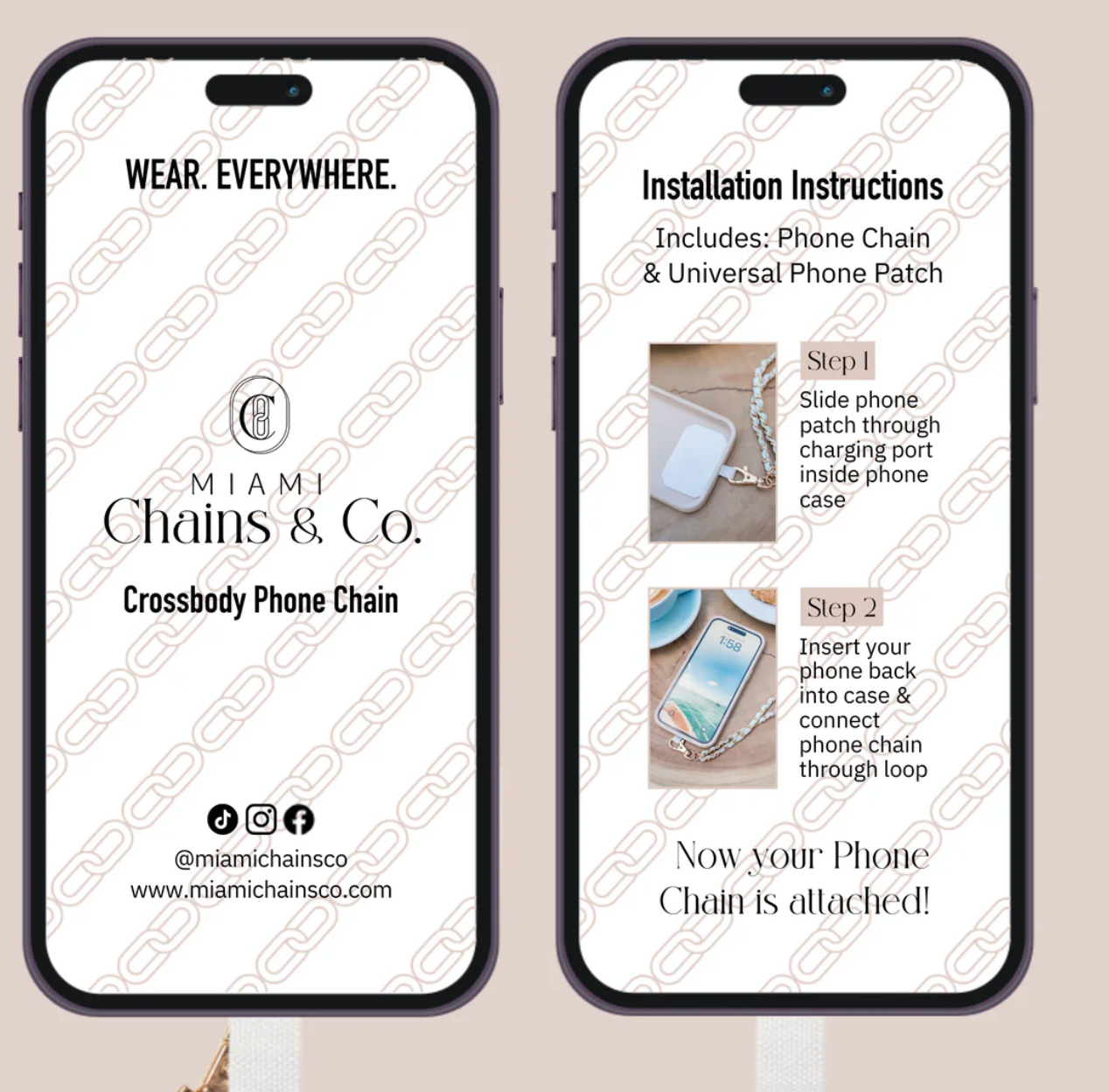 Each Chain comes with an ultra-thin phone patch that comfortably fits between any phone and its case, enabling you to connect the chain to the patch through the charging port.