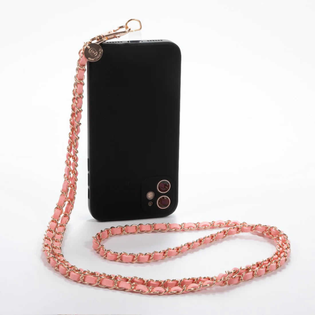 Rose Gold Plated Crossbody Phone Chain with 100% Pink Suede Woven Throughout. With Phone Chains this chic, there has never been a more convenient, lightweight, and fashionable way to keep your phone with you; hands-free.