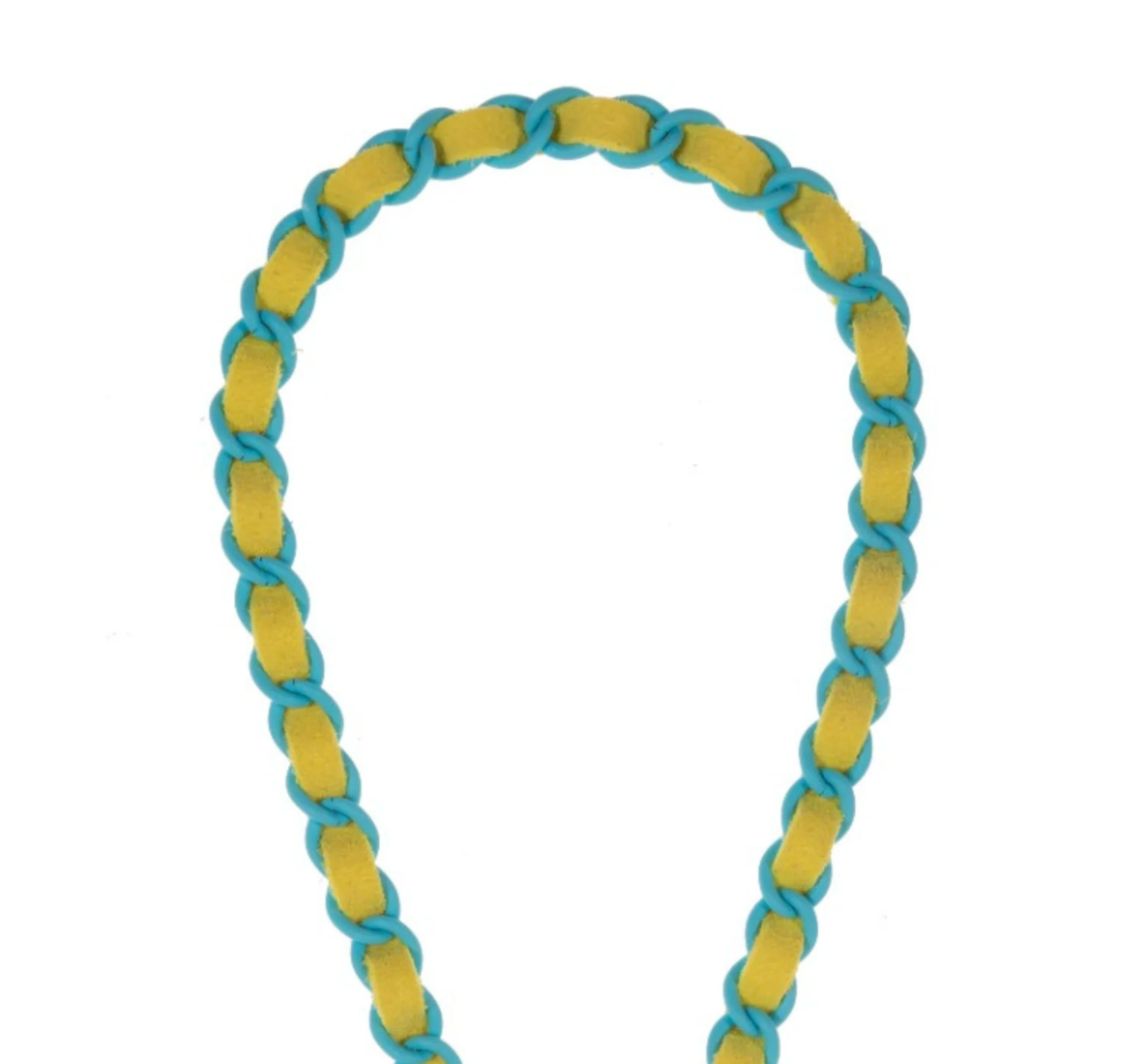 Phone Wristlet featuring Matte Turquoise Plated Chain w/ 100% Yellow Woven Throughout. Turn your phone into a wearable accessory that keeps you hands-free... think of it as a bracelet for your cell phone!