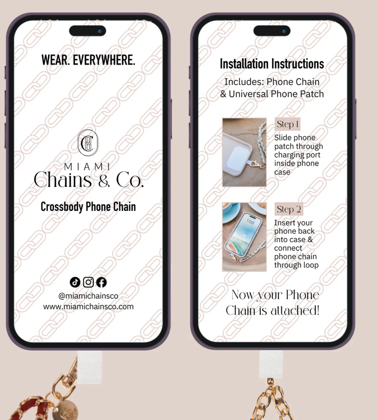 - One chain fits all phones: with your existing phone case!